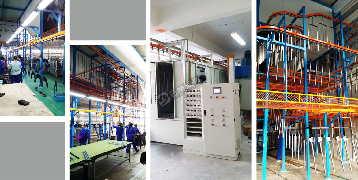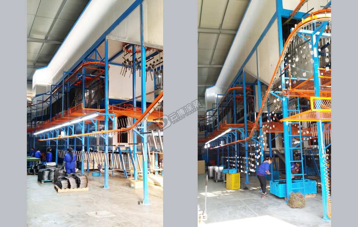 此涂裝線為電視機支架的全自動涂裝線,采用噴淋+游浸結合的前處理工藝,此線采用立體空間布線,上下三層設備,設備最高點11米高,大大節(jié)省了設備安裝空間。